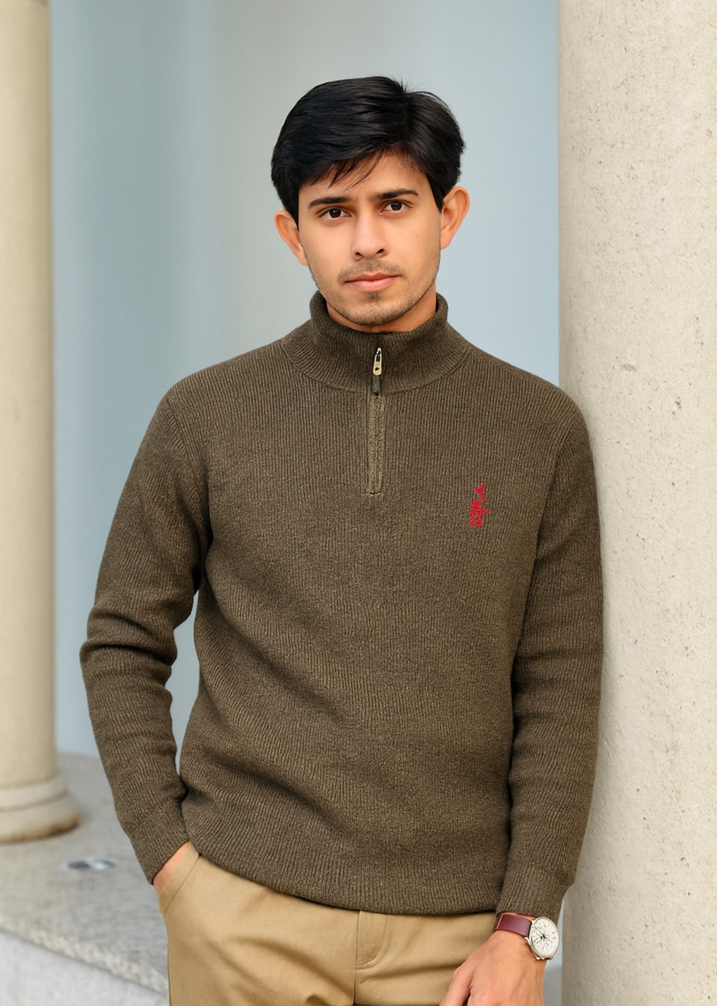 Unisex Half Zipper Sweater-(Olive)